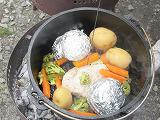3日間の食事です。食堂での食事は1日目の昼と夜、2日目の朝と夜、3日目の朝です。野外炊事場では、2日目の昼食はピザ、3日目の昼食はローストポークと野菜にご飯をつくりました。ピザはピザ釜で、ローストポークと野菜はダッチオーブンで作りました。1班から3班まで、食材の切り方や大きさ等工夫して調理し、盛り付けをしました。