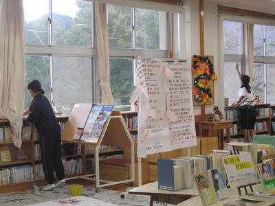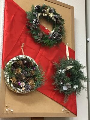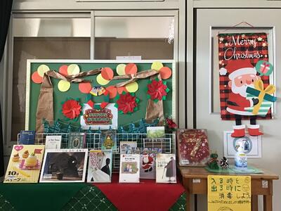 KLVの皆さんが図書室を彩ってくださいました。今回はすてきなクリスマスリースなどを手作りして飾ってくださいました。また、図書支援委員さんは、クリスマスにちなんだ本を選んで展示してくださいました。図書室や本を通して、生徒も季節を感じています。