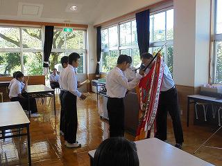 <地区新人大会優勝の野球部と準優秀賞の剣道部女子団体の生徒への優勝旗並びに賞状伝達>