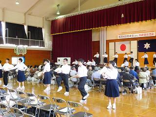 高齢者交流会実行委員の生徒による司会進行のもと、板荷児童館の幼児たちのダンス、板荷小低学年のダンス、高学年の合唱、そして最後は板荷中生徒による踊り「黒田節」と全校合唱を披露しました。途中、一般の方々によるマジックショーのお楽しみもありました。