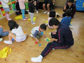 10月11日(木)3年生が家庭科の授業で、板荷児童館を訪問して保育体験学習を行いました。生徒達は、訪問前に遊び道具を自分たちで考え製作する等の授業を通して、幼児の遊びの意義について理解し、今日の保育体験学習では、どうしたら楽しんでもらえるか、幼児とのかかわり方を工夫しながら交流することができました。生徒達の素直な笑顔も印象的でした。