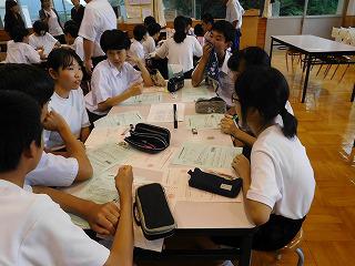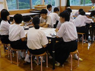 今日の放課後は、9月中旬から実施される今年度2回目の福祉施設「無量荘」訪問に向けて、各班で計画立てをしました。1学期の訪問の反省を生かし、どんなことを目標にしたり、気をつけたりして訪問に臨むか、また、どんな活動をして喜んでいただくか等を話し合いました。話合いに参加していない生徒など誰もいません。皆、自分達が楽しむのでなく、どうしたら楽しんでもらえるのかを真剣に考え、アイディアを出し合っていました。とてもすばらしい!