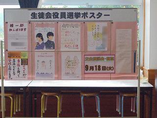 <昇降口に設置された選挙ポスター掲示板> <立候補者7名が堂々たる演説を行いました>
