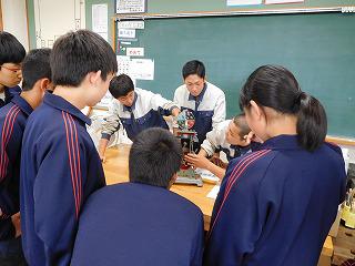今日は、県立今市工業高校の機械科の3年生3名と先生2名に来校いただき、2年生の技術家庭科の授業で「エンジンの仕組み」について学びました。