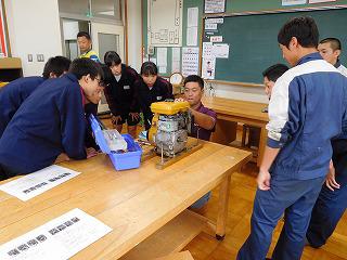 まず、高校生からエンジンの種類やそれぞれの特性等を説明してもらいまいました。次に、エンジンを起動する体験をしたり、エンジンを解体してその仕組みを実際に見てみたりしました。高校生3名や先生の説明はとてもわかりやすく、中学生は皆熱心に聞いていました。おかげで、エンジンについてたくさん理解することができました。今日から、身近な実社会の中で自動車など様々に利用されているエンジンを使用した機器等を見る観点が変わることでしょう。