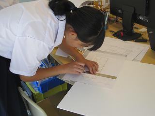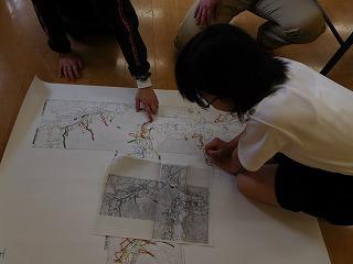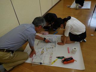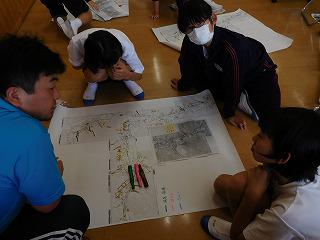 午前中は自然体験交流センターや学校付近をフィールドワークし、外部講師の渡辺明恵さんから危険箇所等の説明をしていただきました。午後は、フィールドワークで得た知識を自分の地区にあてはめ、どんなところが危険かを考えてハザードマップを作成しました。最後に、「もし、通常の通学路等が絶たれたら、どのような経路を使うか。どこに避難すべきか。」等を発表し合いました。