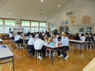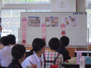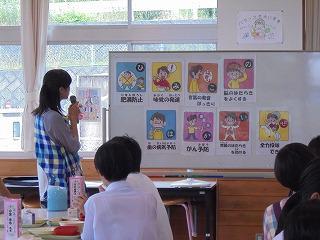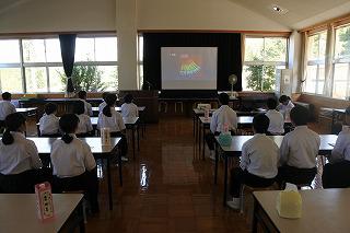 本校では「食育の日」として、2ヶ月に1回程度板荷小学校の学校栄養士の先生を講師として、食に関する指導を行っています。食育はとても大切なものですので、本当はあらためて時間をとって指導していきたいところなのですが、時間設定が難しいため、昨年度から「おいしい給食をいただきながら、食についての話を聞く」という形で実施しています。