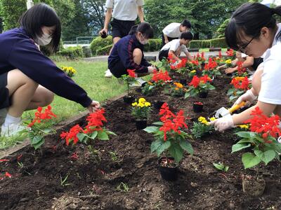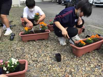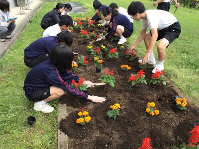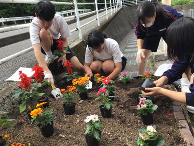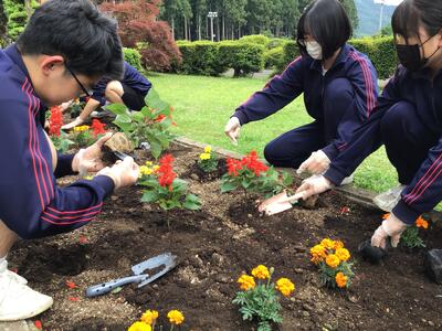 5/28(水)に、第1回「愛校の日」活動を行いました。今回は、全校生徒で花壇の花の植え替え作業をしました。学校がとても彩り鮮やかなになりました。