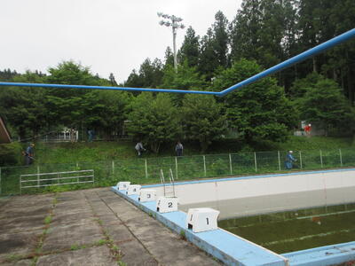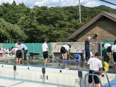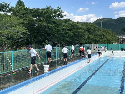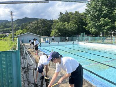 今年は、小学校のプールをお借りして、水泳の授業を実施するため、小学校のプール清掃を行いました。手際よく、懐かしのプールの清掃に一生懸命取り組んでいました。 きれいなプールでの水泳学習が楽しみです。