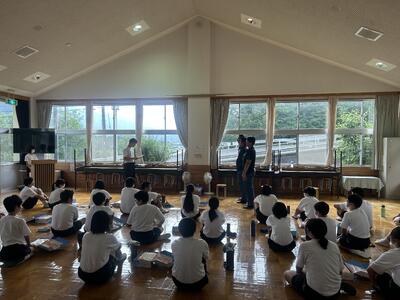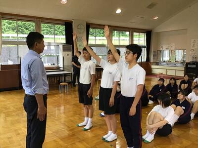 今回は、震度5弱の地震発生による建物の損傷を想定し、小学校へ避難しその後、保護者に児童、生徒を引き渡す訓練でした。御協力いただいた保護者の方、ありがとうございました。