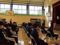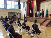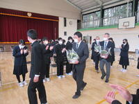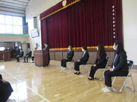 昨年度は新型コロナウイルスのため、臨時休業となり中止しました離任式ですが、今年度はスペースを広く取れる体育館で行いました。卒業生も感染対策を行い参加しました。