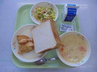食パン(チョコパテ)、牛乳、唐揚げレモンソースがけ、コールスロー、クラムチャウダー