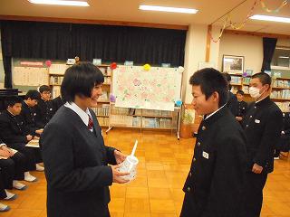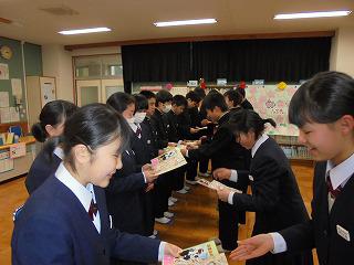 さて、放課後は1,2年生の企画による「3年生を送る会」が行われました。1,2年生が心を込めて作成した写真とメッセージが3年生に贈られました。最後に、3年生の生徒会長より2年生の生徒会役員へ校旗の引継ぎ等が行われました。