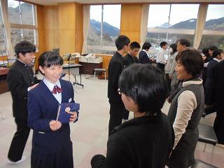 「別れの儀」は、号令無しで全校生が呼吸を合わせながら、自然な流れの中で行われる生徒達の手による儀式です。まず、在校生が卒業生一人一人に対して感謝の気持ちを込めた「贈る言葉」を述べました。その後、卒業生が「答辞」として、在校生に感謝の言葉と励ましを述べ、卒業生による合唱、そして最後は全校生による合唱が行われました。1年間の思い出がたくさんつまった全校合唱曲「空高く」が体育館いっぱいに響き渡りました。