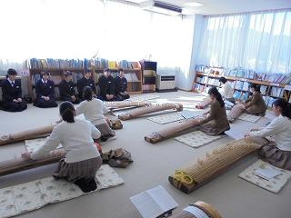 2月19日(月)の1校時目に、1年生が板荷小学校に行って「箏教室」に参加しました。これまで3年生で実施してきた箏教室ですが、入試や各学年の音楽科の指導内容を考慮した結果、今年度から1年生で実施することにしました。