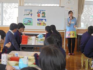 学校給食は明治22年に山形県で始まり、その後全国に広がるものの、戦争で一時中断、戦後すぐに復活し、昭和25年には「全国学校給食週間(1月24日~30日)」が設定される等、これまでの学校給食の歴史などのお話をしていただきました。