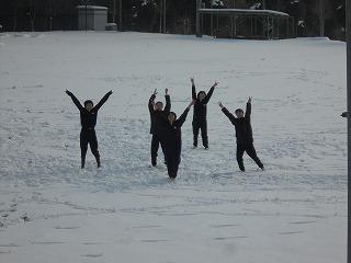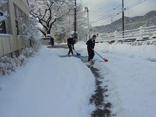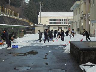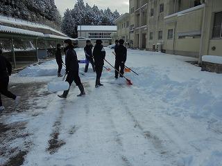 <早目に登校した生徒達は校舎北側の雪かきに汗を流しました。>