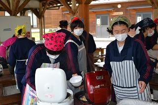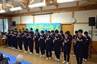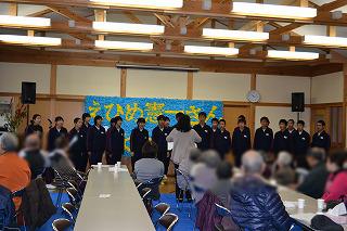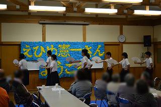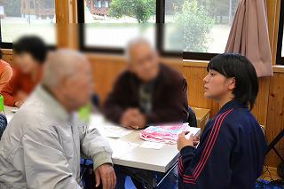 本校ではボランティアという位置づけですがほとんどの生徒が参加し、昼食づくりや配膳のお手伝いをしました。また、午前と午後の部それぞれの余興にも出場し、恒例の踊り「黒田節」、「全校合唱」、「リコーダー演奏」「3年生のダンス」等を披露しました。また、通所している方々との「ふれあいタイム」の時間も設け、楽しく会話したり、肩をもんであげたりして交流を図りました。