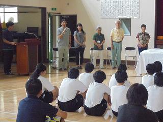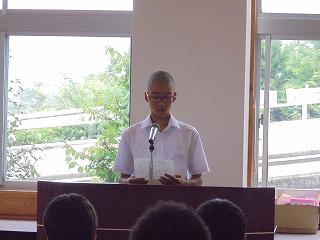 校長式辞では、全生徒が「自主的に行動すること」を意識して頑張った1学期の活躍を賞賛するとともに、充実した夏休みを送るために、1,2年生は部活と学習の両立の大切さ、3年生は部活動引退後新たな目標に向かって切り替えを行う大切さ、そして全校生に交通事故や水難事故に十分気をつける等の命の大切さを話しました。
