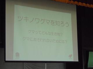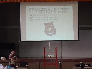 近年、市内や地域内で熊が出没したとの連絡を受け、生徒に注意を呼びかけることが増えています。そこで、7月14日(金)3校時にクマレクチャー(クマ生態普及啓発事業)」を開催しました。鳥獣管理士の方をはじめ5名の方にお越しいただき、熊の生態、熊に出会わないためにすべきこと、出会ってしまったときの正しい対処法などについてお話をいただきました。(板荷小でも同日に開催)