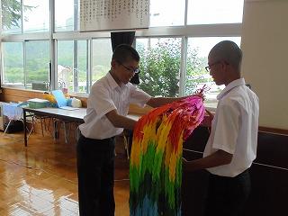 代表生徒の決意が述べられた後、全校生が心を込めて折った千羽鶴が代表生徒に渡されました。この平和の祈りが込められた千羽鶴は代表生徒によって式典会場に届けられることになります。