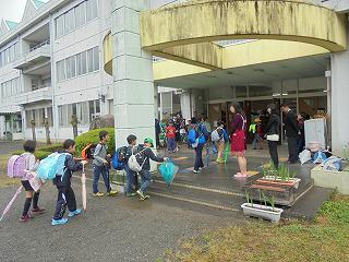今週(5月15日(月)~19日(金))は、小中一貫教育の取組の一つである小中合同の「あいさつ運動」週間です。中学生は登校班を編成し集団登下校をしていますが、その登校前に割り当てられた登校班が板荷小学校の昇降口に集合し、小学生の当番さんと一緒に小学生を出迎え、あいさつを交わします。