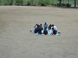 今日は野外給食にふさわしいさわやかな五月晴れで最高の天気です。学級ごとに好きな場所を決め、みんなで円になり、生徒達はとても楽しそうに食べていました。