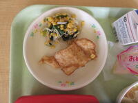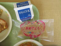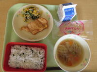 給食の献立は「卒業お祝い献立」でした。牛乳、わかめご飯、鶏肉のレモンソース、おひたし、お祝い吉野汁、クレープ。