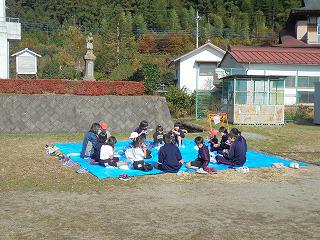 活動終了後は、班ごとに小中学生が円になって野外給食を楽しみました。