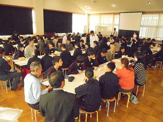 ③ 講話をふまえた正しい姿勢についての班別協議。(指導的立場の方、保護者、小中学生、小中職員が一緒に協議しました。司会進行及び発表は中学生が担当しました。)