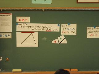 授業は「三角形の和が180°であることを説明しよう」という内容でした。参観者が多くて生徒は少し緊張した様子でしたが、全生徒が真剣に三角形の和が180°になる理由を考え、その理由を相手が納得するように説明するにはどうしたらよいか等をグループ内で考え合い、発表しました。