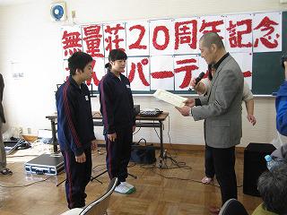 今年「無量荘」は20周年を迎えられました。板荷中は当時から20年間の交流を行っており、開会行事の中で「無量荘」から板荷中の代表生徒へ感謝状と記念品が贈呈されました。今後の本校の福祉教育の推進において大変励みとなる感謝状をいただき、心より御礼申し上げます。なお、記念品は本校の図書館教育の充実のために使わせていただきたいと思います。