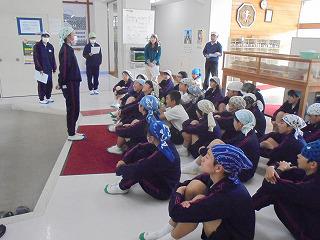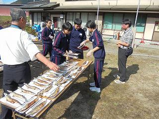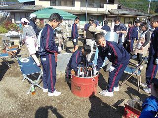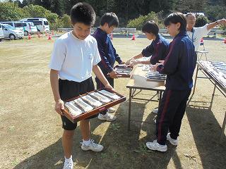 本校では生徒31名がボランティアとして参加し、けんちん汁作りやさんまを焼くお手伝い等をしました。昼食後には、恒例の黒田節を披露したり来場者全員による合唱も行いました。