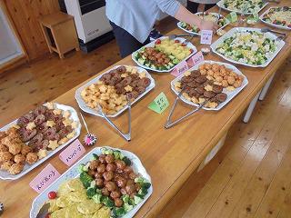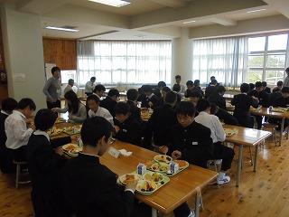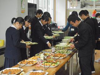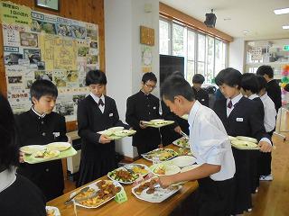高齢者交流会終了後、板荷中の生徒は、会場の板荷小でバイキング給食をいただきました。本当にレストランでバイキング料理をいただいているような本格的なものでした。いただいた料理はどれもこれもとてもおいしく、生徒は全員笑顔で、楽しい時間を過ごすことができました。朝早くから御準備いただいた板荷小の牛込栄養士さんと調理員さんに心から感謝申し上げます。