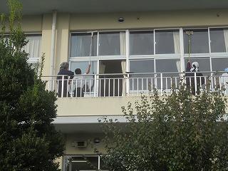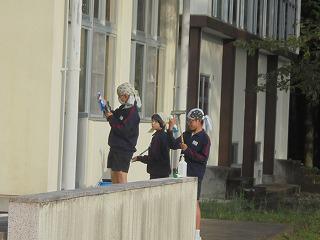 本校では、月一回程度、清掃の時間を15分延長し、約30分間の校舎内外の美化活動を行う「愛校の日」活動を行っています。普段の清掃の時間は教師の指導の下で行う当番活動的なものですが、この「愛校の日」活動は、先輩たちが大切にしてきて今もなお美しく整備された学校環境を、自分たちの手で守っていこうという愛校心を育てることをねらいとし、美化奉仕委員会が中心となって行う生徒会活動です。本年度6回目となる10月21日(金)は、清掃の時間ではなかなか手が回らない窓ふきや、窓のさんや窓枠等をきれいにする作業をしました。鳥の糞や虫の死骸があって、それを見つけるたび生徒たちは悲鳴をあげたり顔をしかめたりしながらもがんばって取り除いて、窓ふきに一生懸命取り組んでいました。あっという間の30分でした。