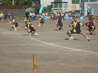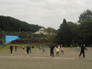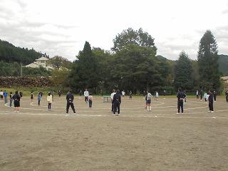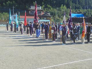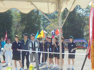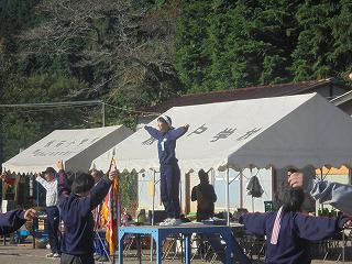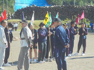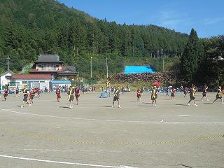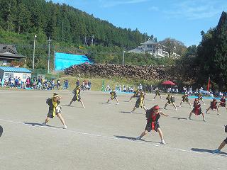 10月16日(日)、快晴の下で板荷地区市民体育祭が開催され、本校生徒のほとんどがボランティアとして着順係、放送係、準備体操係、国旗掲揚係等の仕事に就いて体育祭運営のお手伝いをしました。大人の係の方々の指示を待たずに自ら働く姿が見られ、その責任感と奉仕の心に中学生の成長を感じることができ、大変頼もしく思えました。自分の地区の選手として競技に出場する生徒も多く見られました。また、午後の最初の種目では、小中学生合同で「YOSAKOIソーラン」の発表も行いました。