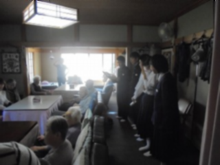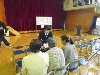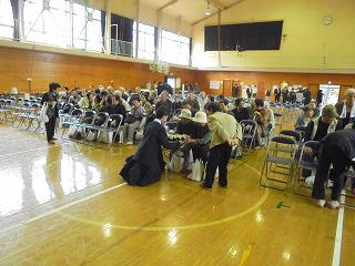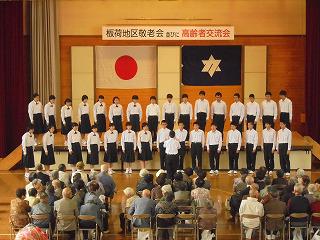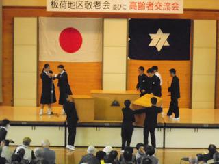 10時15分から、いよいよ板荷中生徒会主催の「高齢者交流会」です。生徒は前日に地域の方々と一緒に会場設営等の準備をし、今日の本番では受付・案内、湯茶の接待、交流会の進行等を行いました。