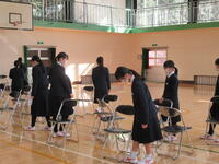また、この時間に、1年生・2年生は体育館で明日行う卒業式全体練習の準備を行いました。訪問日のため来校していた英語科のALTの先生も手伝ってくださいました。残り時間を利用して式の練習も行いました。