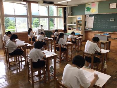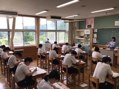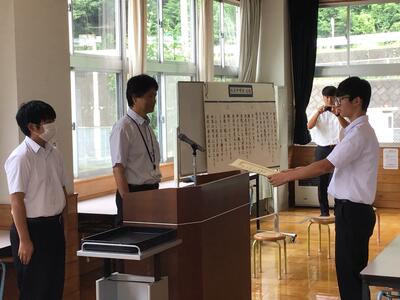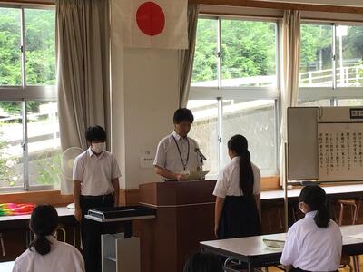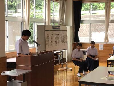 学年代表の意見発表では、「中学校に入って自分で頑張れることが増えた。」「体育の授業から、日頃からの練習が大事と知った。テストに向けて頑張りたい。」「学習、合唱の練習を頑張りたい。また、高校見学で自分の進路を決める参考にしたい。」などと、1学期の振り返りや夏休みの目標を、しっかりと発表してくれました。