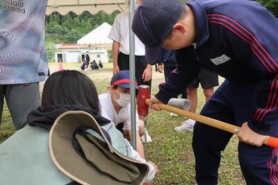 くいを打ち込んでテントを固定します。