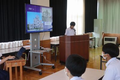 「広島平和記念式典」への中学生派遣事業はコロナ禍のため中止されていましたが、今年は実施されることになりました。今日は、登校後すぐに食堂に集合して「大会報告会」の後に生徒会主催による学習会を実施しました。