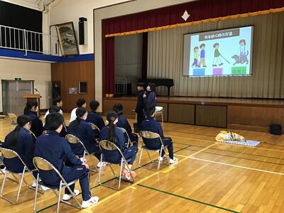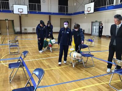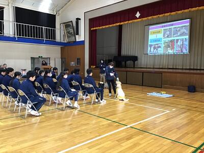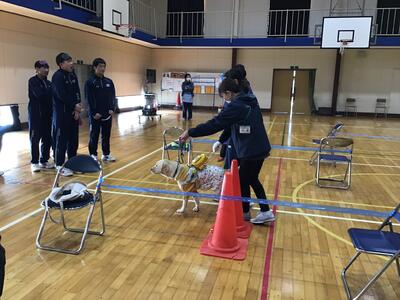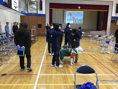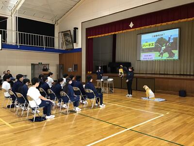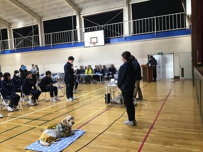 12月18日(木)の午後、公益財団法人 東日本盲導犬協会の多賀様、菅根様の御説明・御指導のもと、「盲導犬との交流・体験」授業が行われました。ロータリークラブや鹿沼市教育委員会 高野指導主事など、10名を超える皆様にも御参観いただき、目の見えない方々や目の見えにくい方々のものの見え方、盲導犬の果たす役割、健常者が理解・協力できることなどを十分に学び・体験することができました。盲導犬体験の実演に参加してくれたラブラドールレトリバーの「イズモ」と「オル」の2頭はとても愛らしく、会場の雰囲気を癒やし・和ませてくれました。一方で、人の安全安心や命を守る盲導犬の役割の大きさと、何事にも動じないまでに訓練を行なってきた盲導犬や訓練士の皆様の御苦労や偉大さも十分感じ、多くのことを深く考え、学ぶことができる機会となりました。