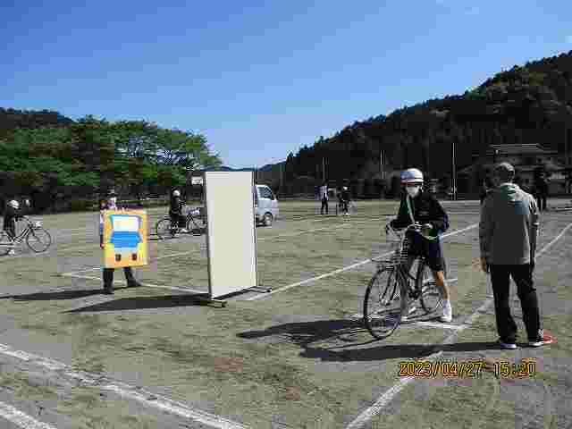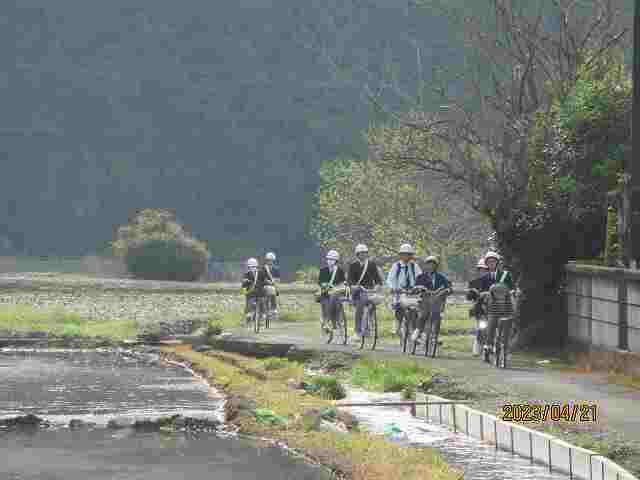 自転車通学の生徒は、きちんとヘルメットをかぶり、たすきを掛けて登校しています。