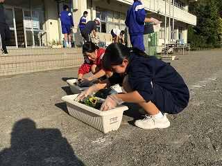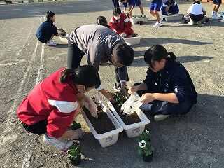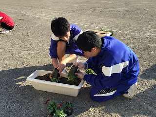 11月2日に全校生徒で、美化委員長の指示のもと、パンジーの花植えを行いました。
