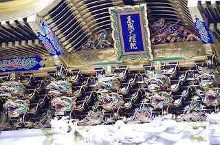 輪王寺です。中央の金堂とある緑色の看板の大きさは、畳6畳分ほどもの大きさがあるそうです。この本堂は、東日本では、もっとも大きな木造の建物で、千手観音、阿弥陀如来、馬頭観音の3体の大仏様などが祀られているなどのお話がありました。