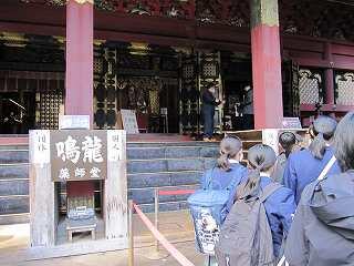 最後に、薬師堂の鳴龍を見学しました。指示に従って、天井に描かれた龍の顔の下に移動しました。お寺の方が、拍子木を打つと不思議と鈴の音のように聞こえ、生徒の皆さんとともにぞくぞくっとするような神秘的な体験をしました。