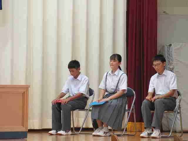 1年生の代表者からは、「定期テストや実力テストに向けて計画的に勉強したい」、「自然生活体験学習に向けて学級で考えたスローガン『一致団結』のもと、協力しながら自分たちで考えて行動していきたい』、「学校祭に向けて、1学期の2・3年生のがんばる姿をみて、2学期は少しでも力になれるように精一杯取り組んでいきたい」などの発表がありました。