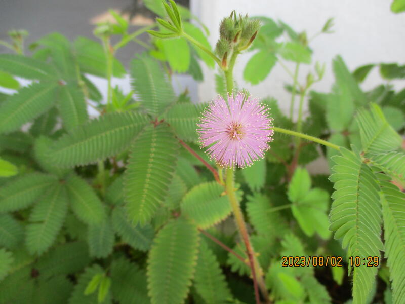 子どもたちが蒔いたオジギソウにかわいらしいピンクの花が咲きました。
