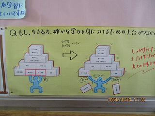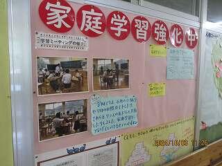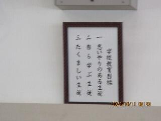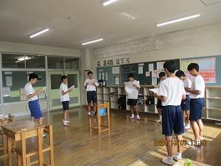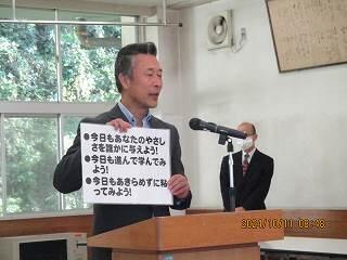 また、教育目標について、朝、これを見て意識をもって行動し、帰り際に、これをもう一度見てふりかえってほしいとし、「思いやり」については、思いやりの行動は、人間関係をつくる手立ての一つで、「人権コーナー」のコメントが日に日に増えていることなど、「自ら学ぶ」については、朝の学習、家庭学習、昨日のマイリサーチの職業人の方々からの講話についてのお話がありました。また、「たくましい」については、何事も諦めずに、粘り強く行動した結果、自分にとってプラスの方向に作用する可能性があることなどのお話がありました。