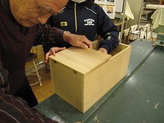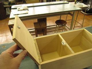 こちらの作品は、中のものが見えないようにしたいという計画から、蝶番をつけ、扉をつくりました。